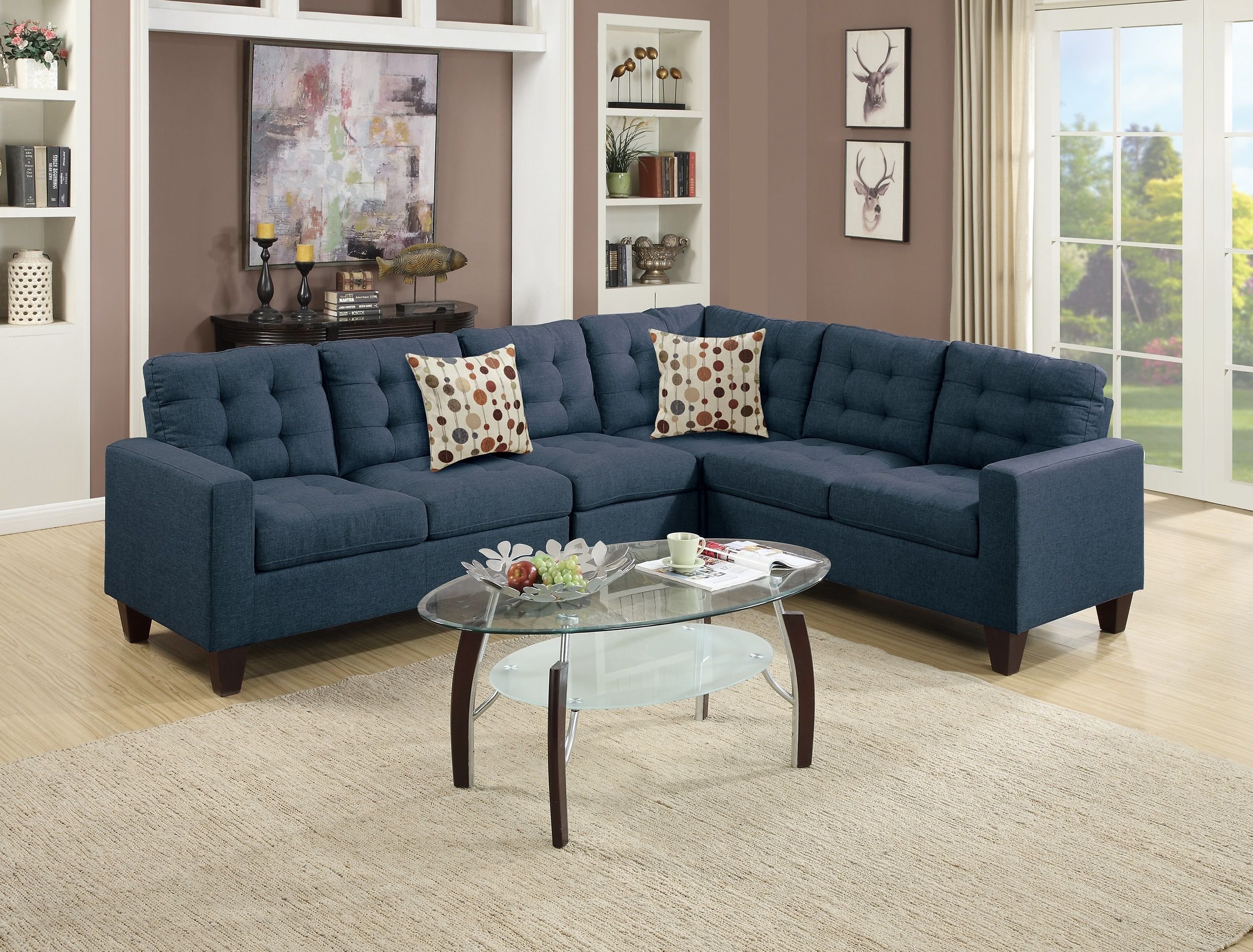 Description :-Fusing the contemporary and classic design with this collection of 4-piece modular sectionals covered in soft linen. With plush seating and back support, each piece is accented with asymmetrical tufting and stitching to enhance your living space. Compliment the sectional with accent pillows. Available in blue grey, carmine, black and navy polyfiber.Product Dimensions :-LAF ONE-ARM LOVESEAT :- 52" x 32" x 35" HRAF ONE-ARM LOVESEAT :- 52" x 32" x 35" HCORNER WEDGE :- 32" x 32" x 35" HARMLESS CHAIR :- 23" x 32" x 35" HOverall Sectional : 107" x 84" x 35"HListing Includes :- 4pcs Sectional Sofa Set (LAF & RAF Loveseats , Corner Wedge And Armless Chair) Only.Assembly : Simple Assembly Required.Features:-•Modern / Contemporary•Navy Color•Polyfiber (Linen Like Fabric)•Pillows Included•Button Tufted