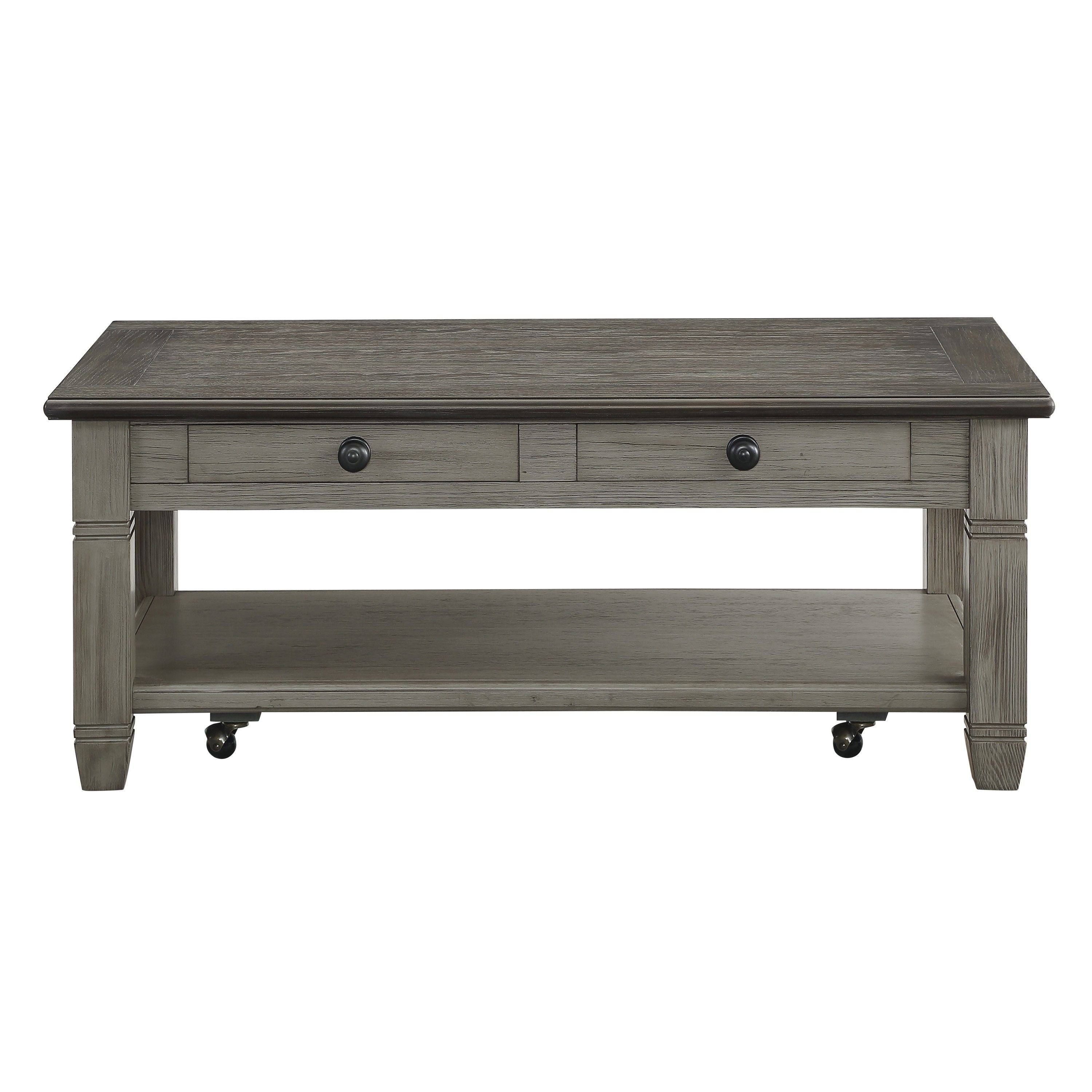 Inspired by the aesthetic of a casual country home and providing functional decorative accent for your living room is the occasional table set of the Granby Collection. The two-tone look of the acacia and pine solids base, finished in antique gray, and the oak veneer of the cocktail table's coffee-finished top, presents as a harmonious combination of color, perfect for your home. Dark finished metal knob hardware fronts the functional drawers of the cocktail table while providing subtle contrast to the finish of the collection. An open display shelf creates a perfect spot for display of your decorative accessories, while casters allow for ease of movement of the cocktail table within your space.PRODUCT DIMENSIONS: Overall Dimension: 48" x 26" x 20"HDrawer interior: 14" x 12" x 1.5"(2)Shelf interior: 43.5" x 21.5" x 8.5"HListing Includes: One Cocktail Table Only.Sofa table and End table: Not included.Simple Assembly Require.