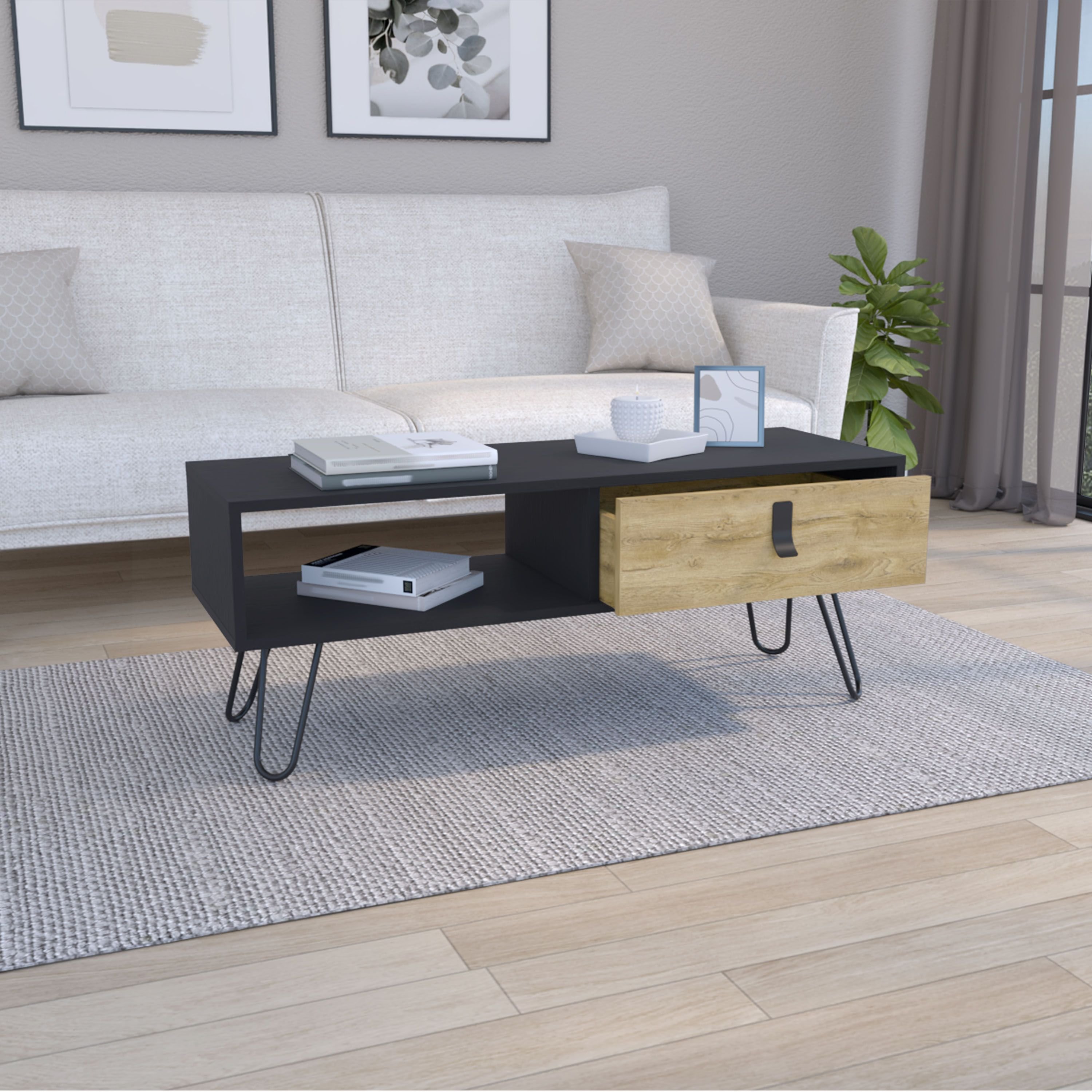 15" H rectangular white / macadamia coffee table, 4 vintage metal legs, 1 vertical divider for designer books, and 1 drawer for storing small things.