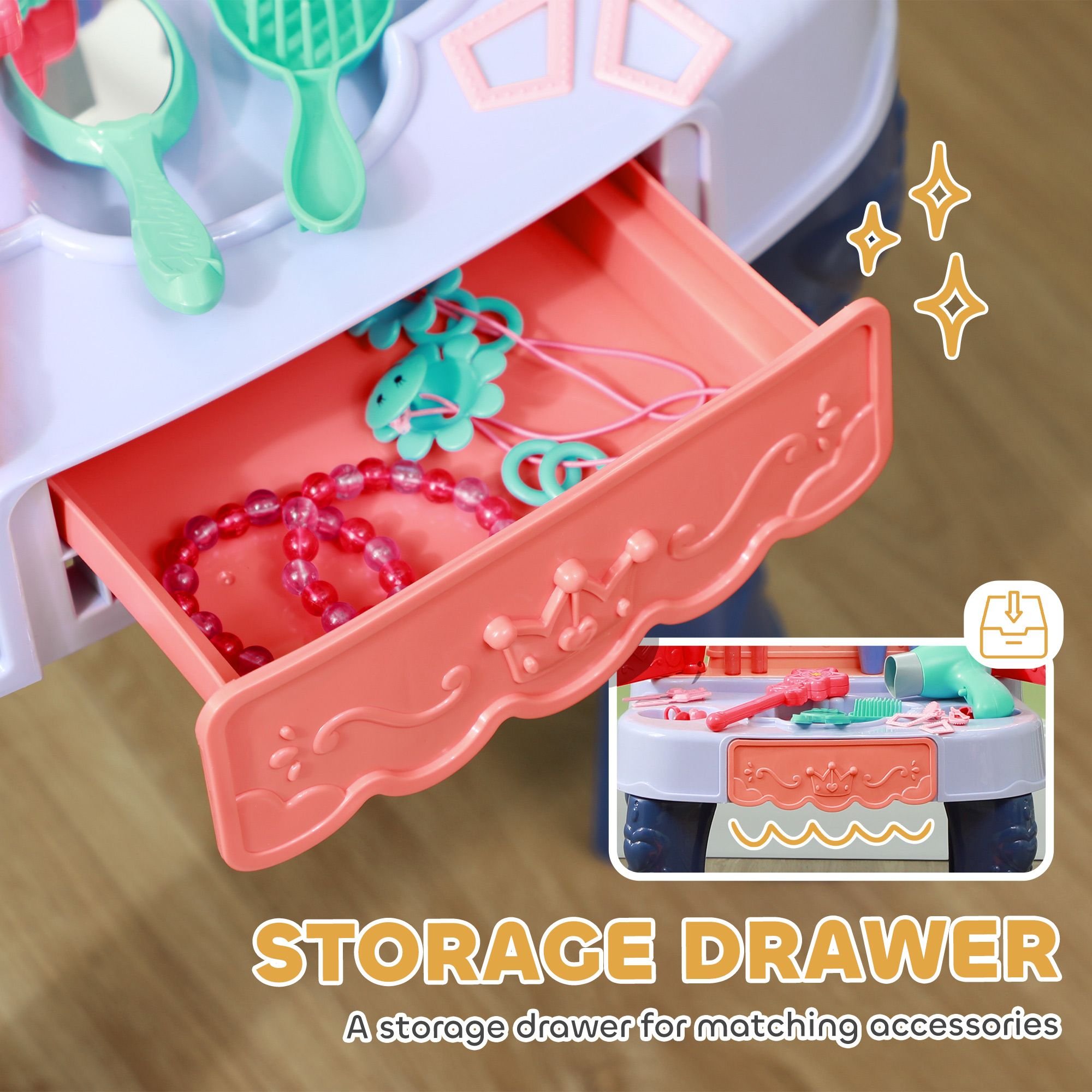 Fun Hairdryer Included: This toddler vanity set enhances your little girl's playtime with a realistic hairdryer that produces a sound and a gentle breeze. Complete with a drawer for tidy storage of all her beloved beauty supplies.