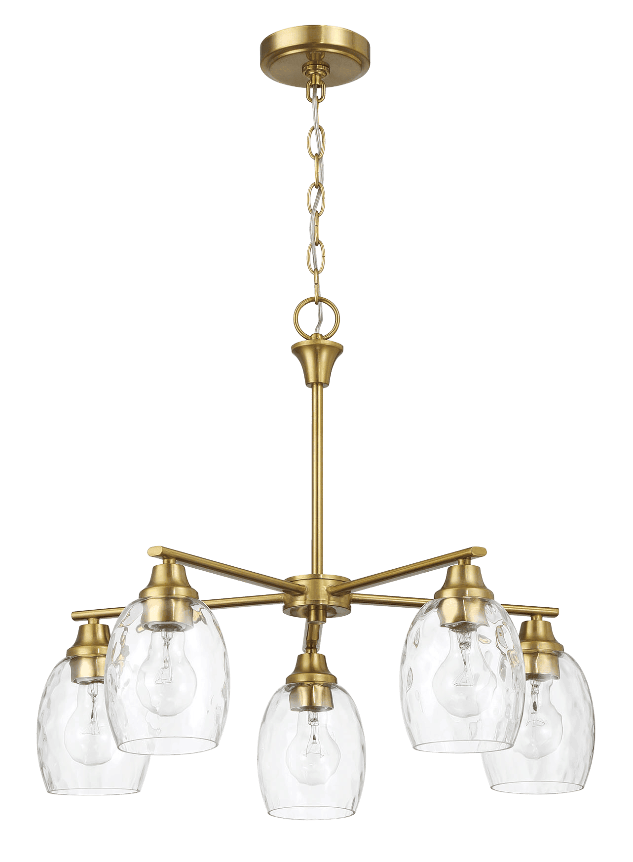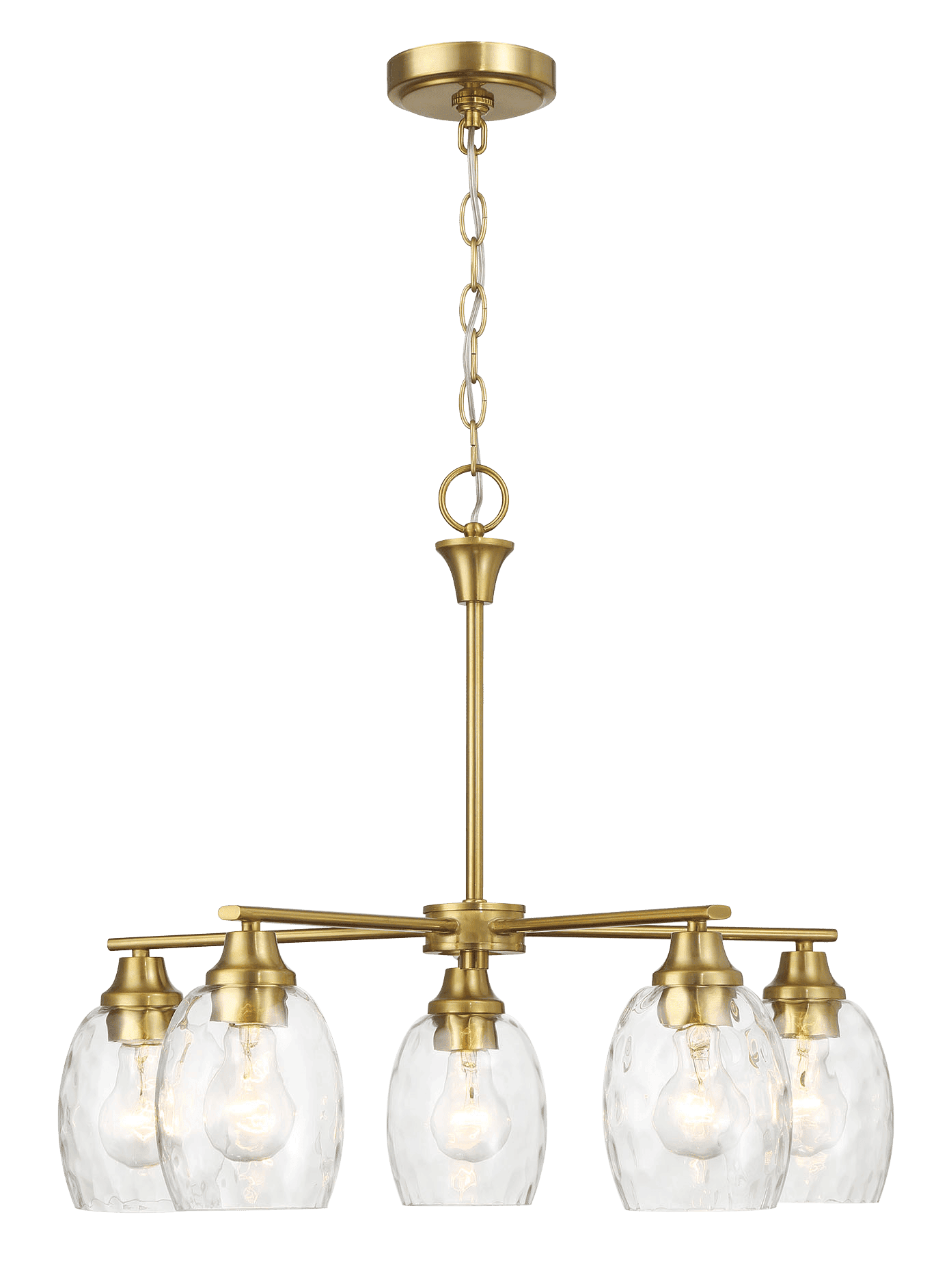Transform any space into a luxurious oasis with our Elegance Chandelier. The golden brass finish and clear water glass add a touch of sophistication to your décor. With five lights and linear arms, this chandelier provides ample lighting and a stunning focal point.