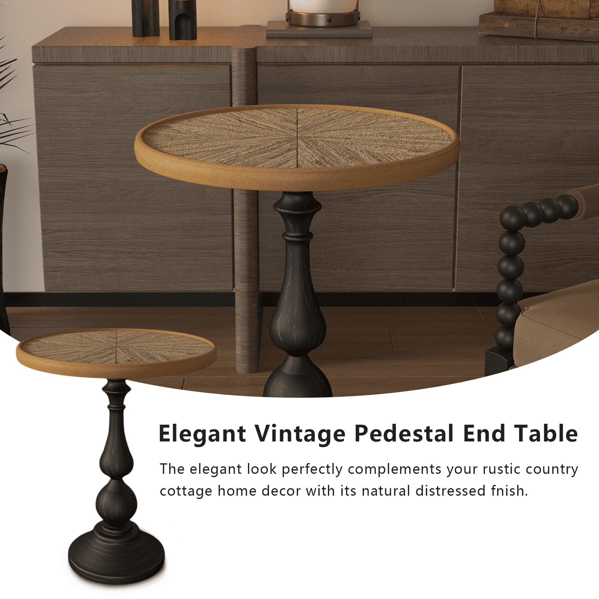 Vintage American Country Side Table Luxury RoundVintage Elegant Round Table: A refined circular design paired with a classic black pedestal base showcases unique vintage charm. The tabletop features exquisite radial pattern woodwork with a golden-brown frame, creating a warm and sophisticated visual appeal.
