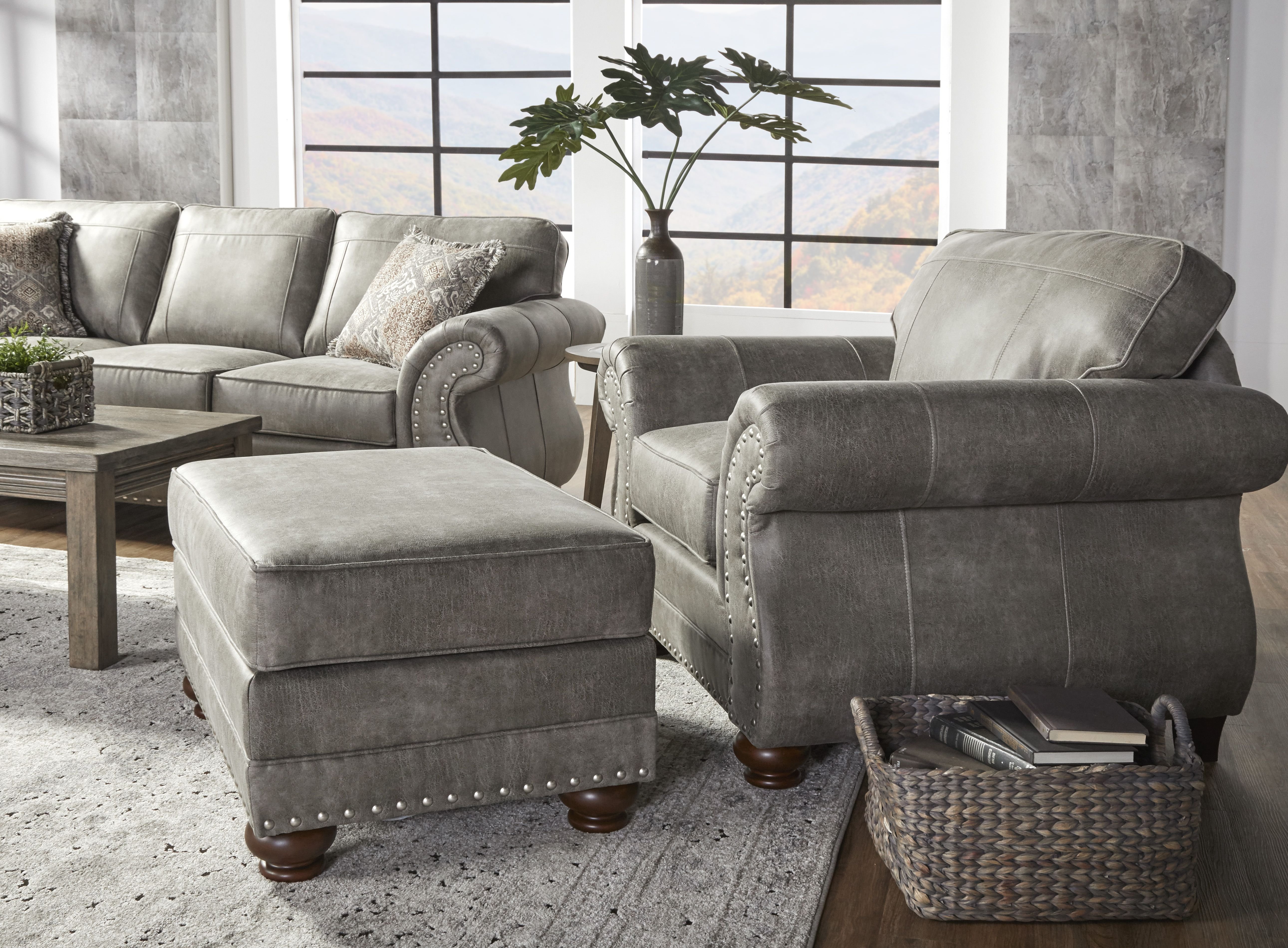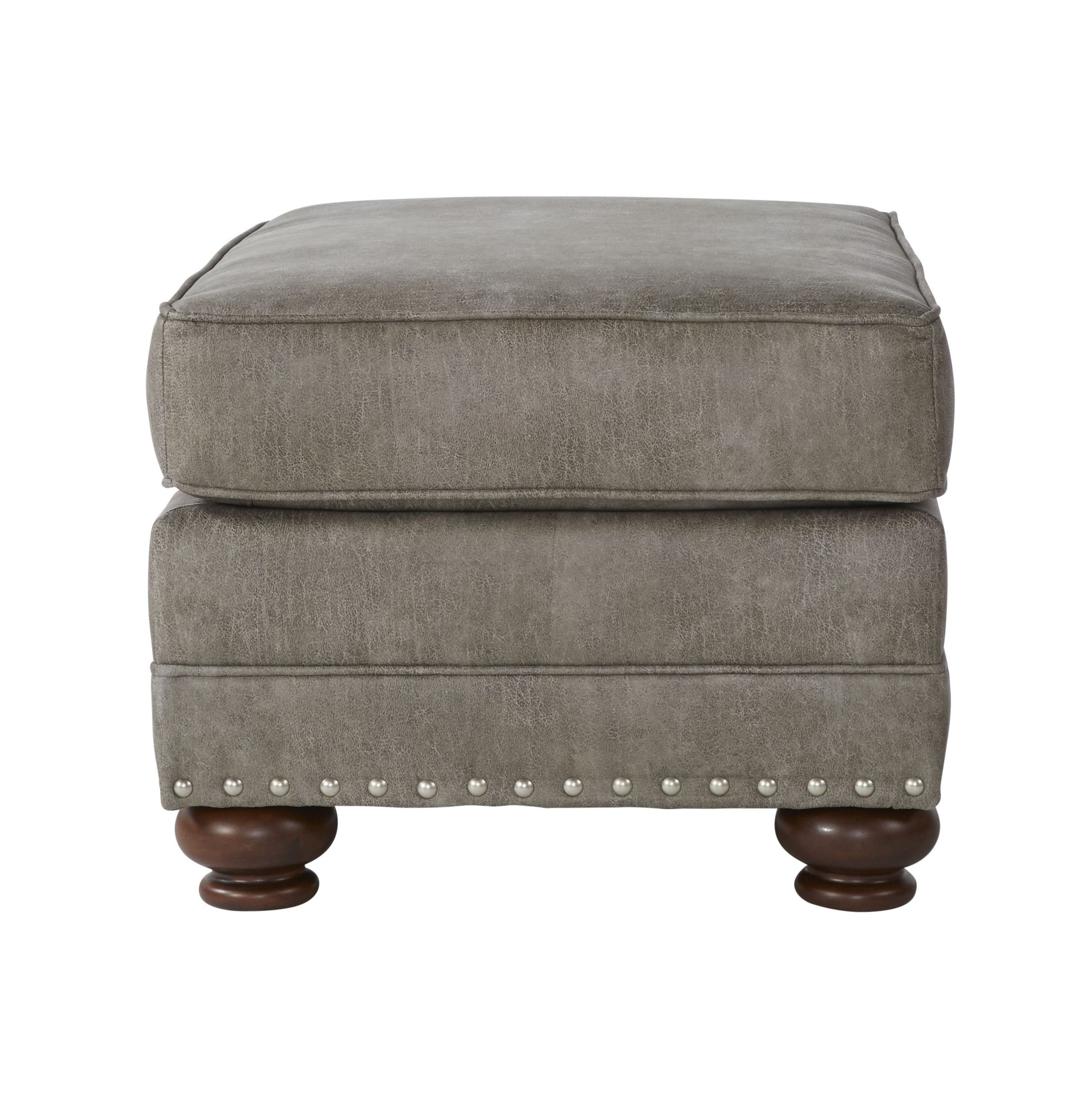 Leinster Faux Leather Upholstered Nailhead OttomanA classic silhouette and antiqued gray coloring make the Leinster Faux Leather Upholstered Nailhead Living Room Collection traditional with a casual twist. This collection is equipped with dramatic rolled arms, detailed welting, and striking nailhead trim. The soft faux leather upholstery comes in a stone gray that coordinates with any decor.
